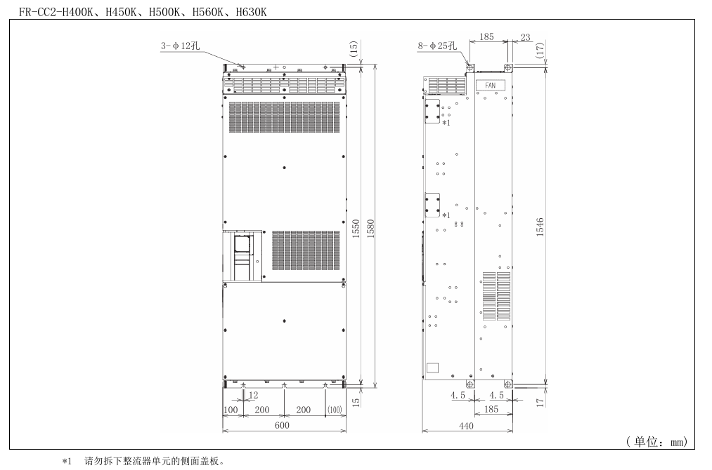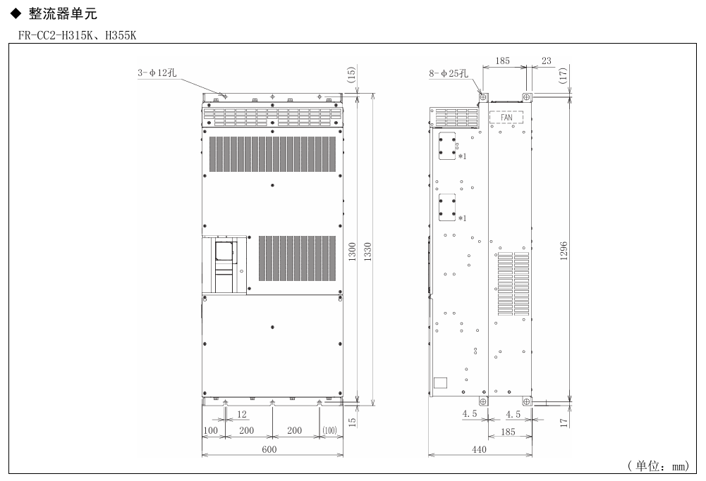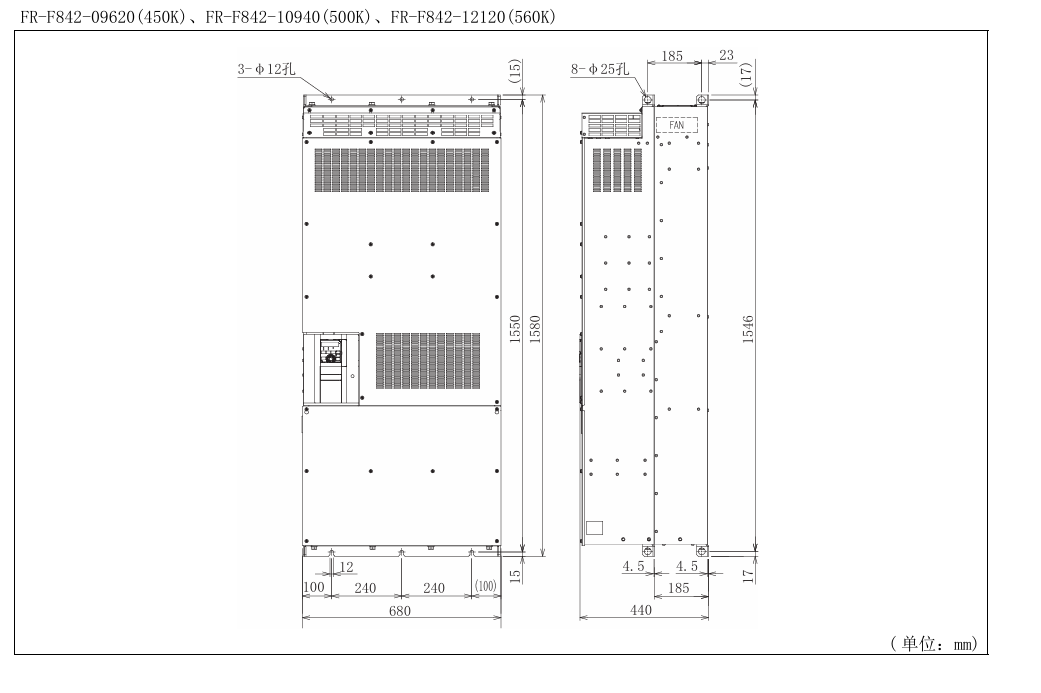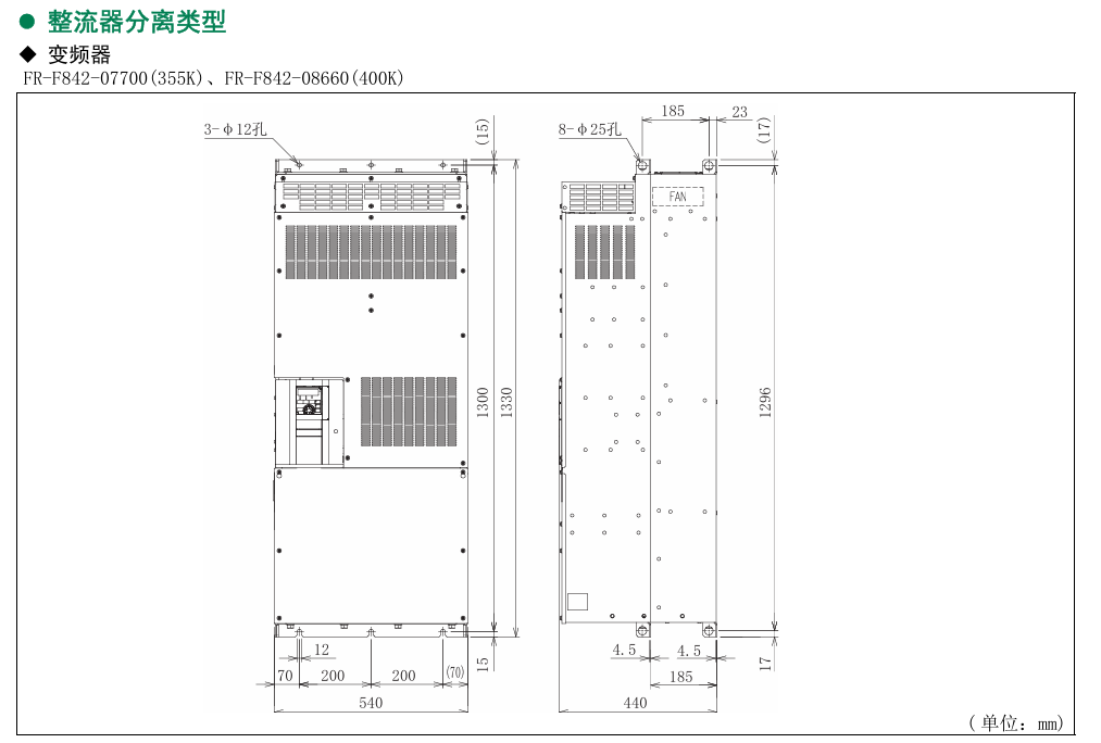 | FR-F842-08660-2-60/450KW | 450KW | 866 | 400KW | 770 | 163 | FR-F840-06100-2-60/280KW | 315KW | 640 | 280KW | 547 | 166 | |
