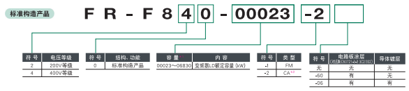 | FR-F820-00167-2-60/3.7KW | 3.7KW | 16.7 | 3.7KW | 15.2 | 3.0 | FR-F840-00083-2-60/3.7KW | 3.7KW | 8.3 | 3.7KW | 7.6 | 3.0 | |
