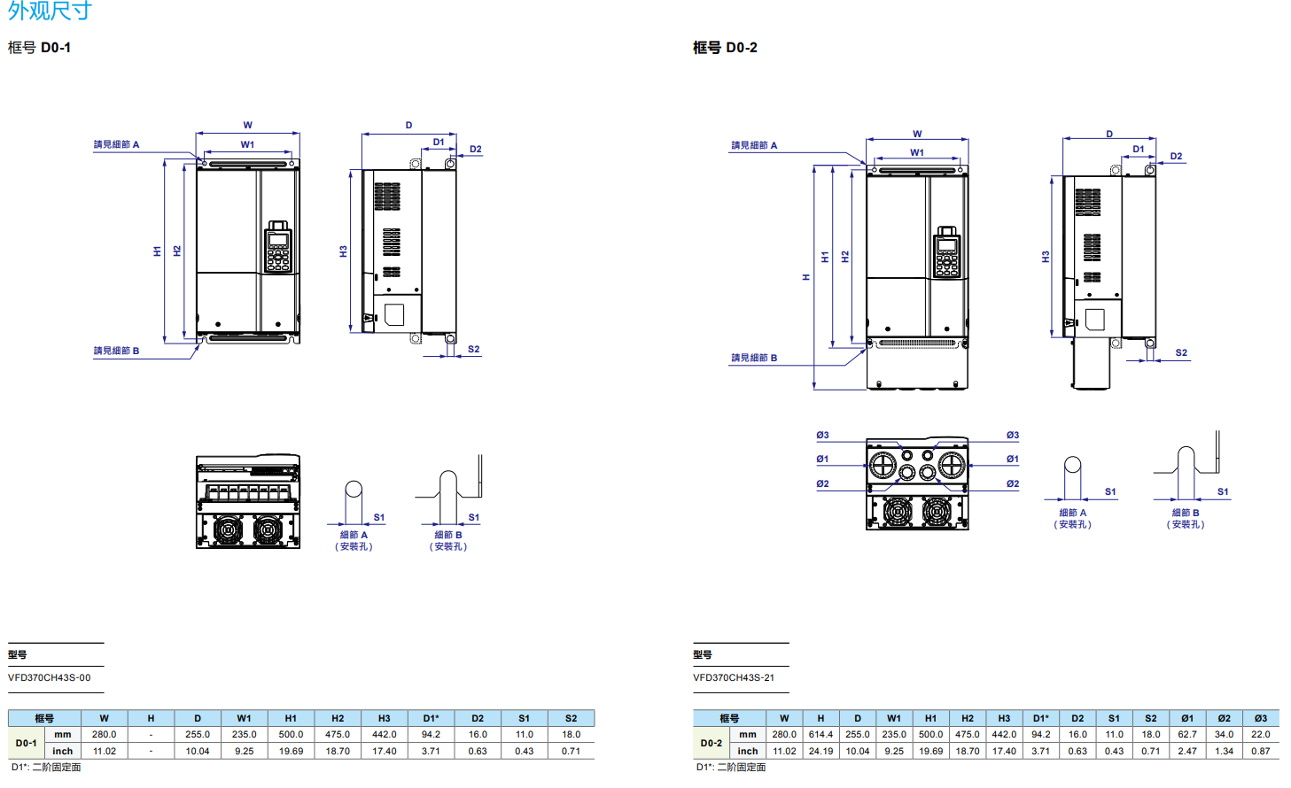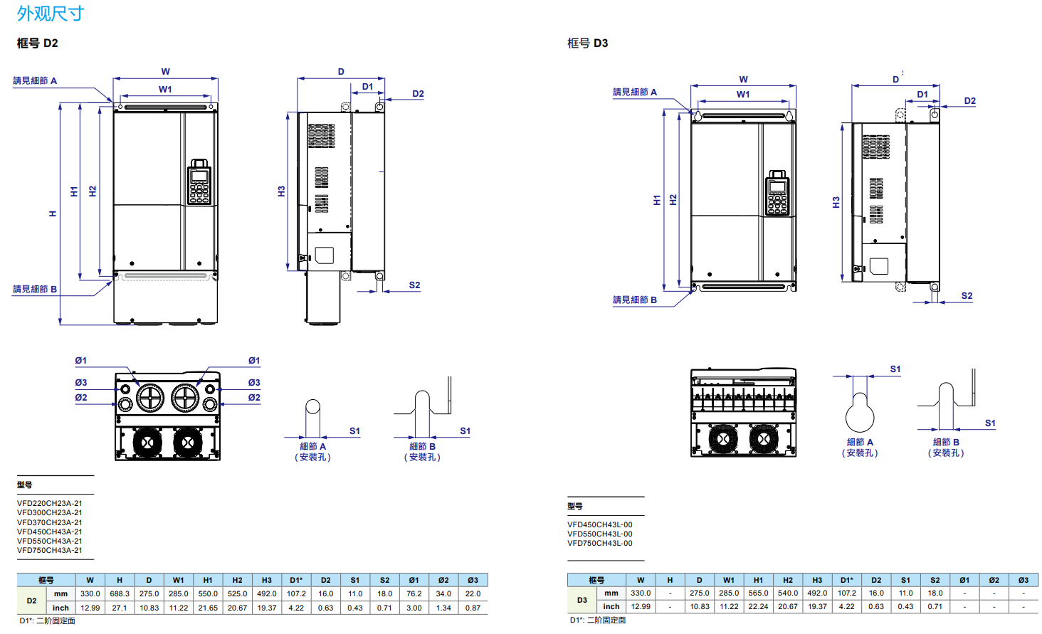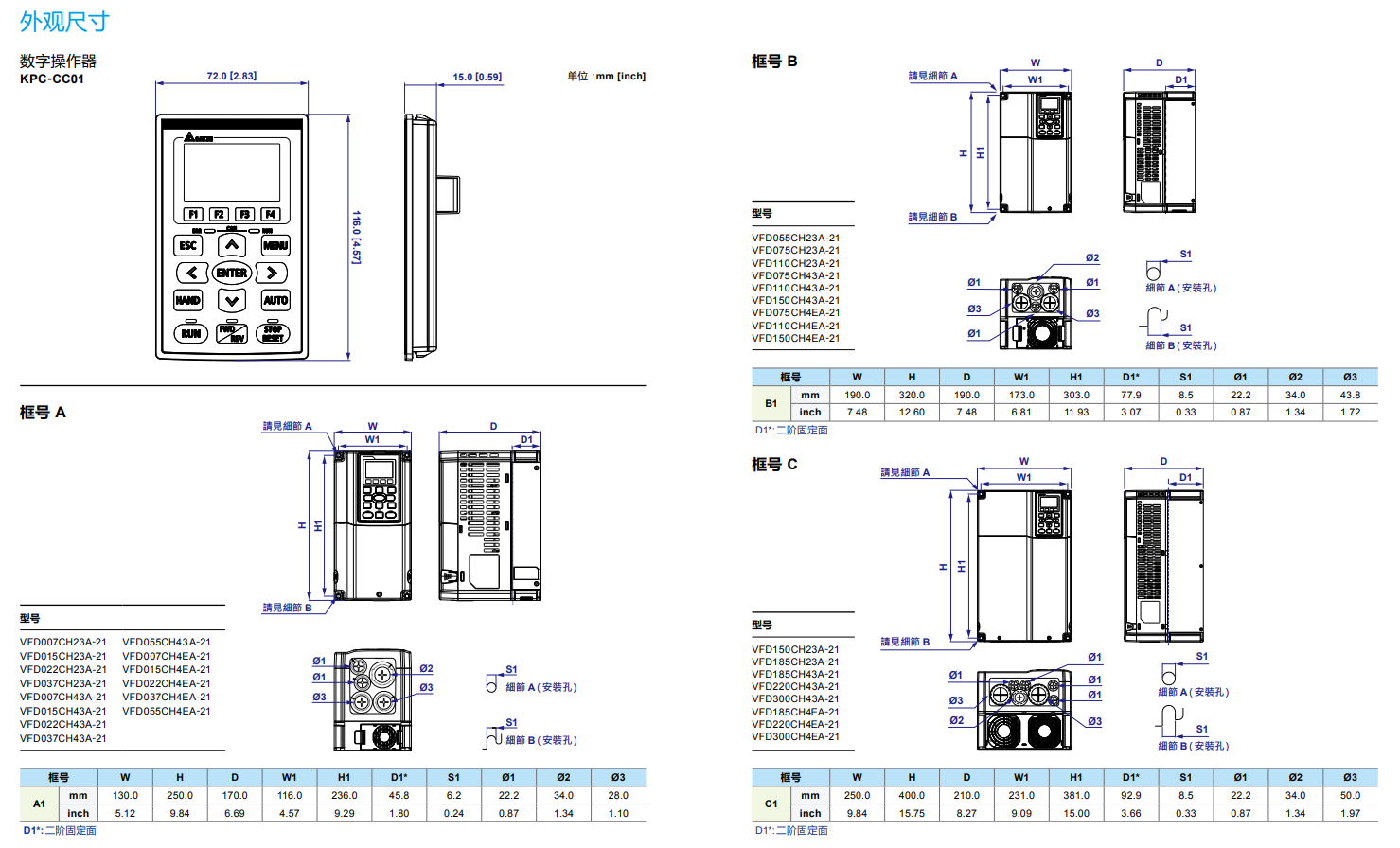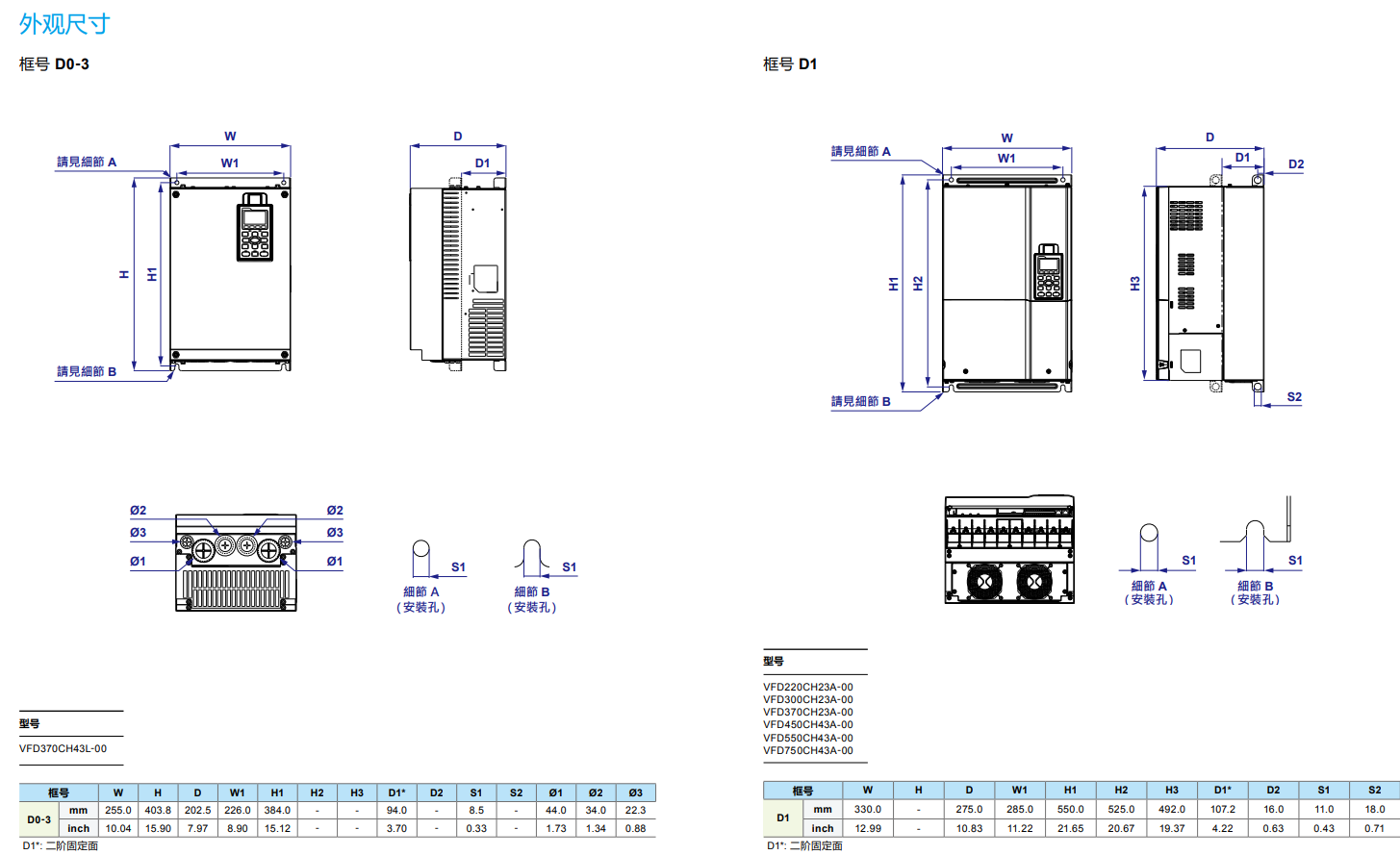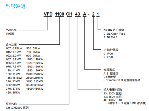 型號(hào) VFD_-_CH23A-XX 007 015 022 037 055 075 110 150 185 220 300 370 450 550 750