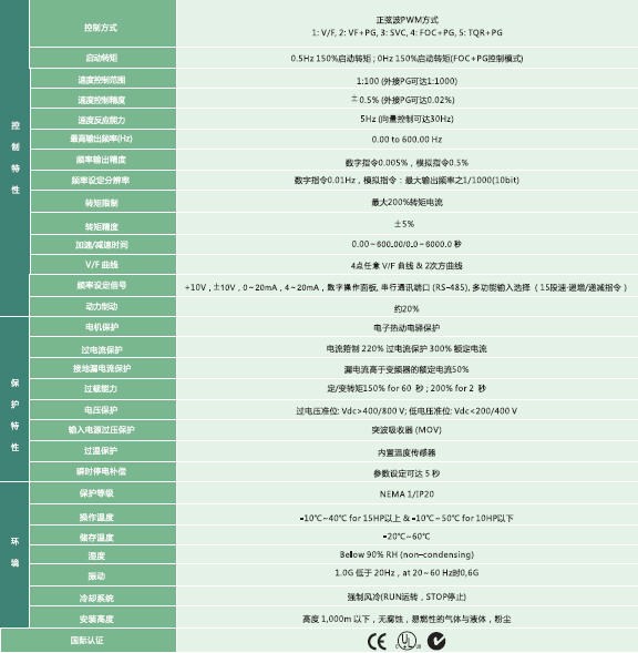 | VFD-007V | 2.3 | 3.0 | 1.0 | 3.8 | 1.5 | 三相對應輸入電壓 | 0.00-600.00Hz | 4.0 | 三相380-480V | 三相,380to 480V | +10%(342-528V) | +5%(47-64 Hz) | 自然冷風 | 2.7 |