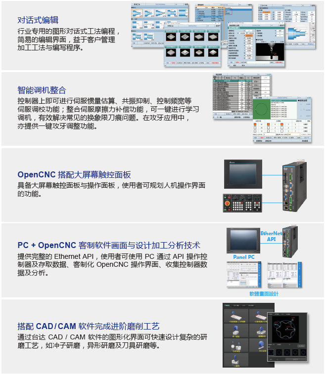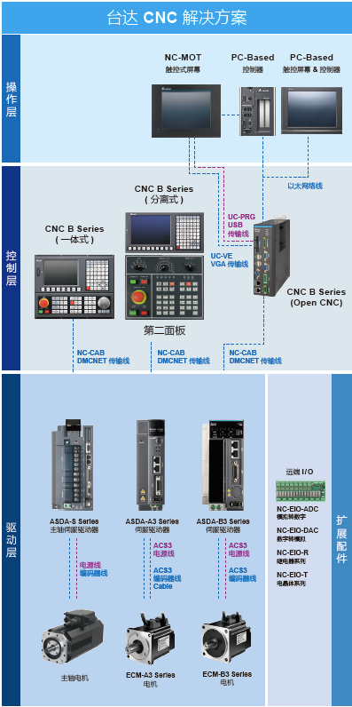 CNC B系列數控系統,根據客戶需求和市場趨勢,整合HMI 平臺操作界面,可依照企業及行業需求,彈性化客制操作界面;并可搭配臺達伺服驅動器 ASDA-A3 / ASDA-B3 系列、永磁主軸系統及交流電機驅動器驅動主軸,以及通訊網絡 DMCNET 等進行速數據傳輸及控制,達到控制機床的電機定速、定轉矩與精密定位。