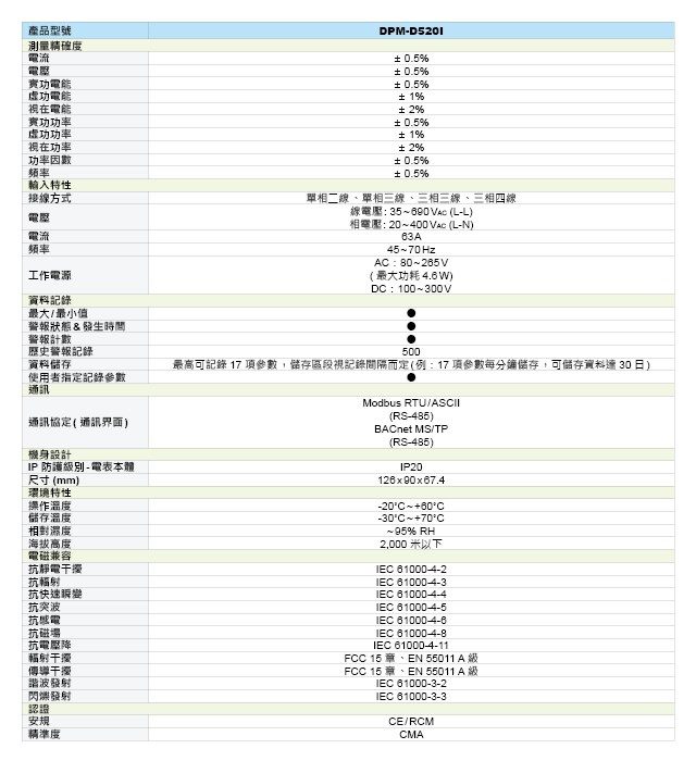臺達導軌型多功能電表(內含CT) DPM-D520I ,可負載63A 電流,適合用于設備機臺、空間有限和緊密安裝的空間。