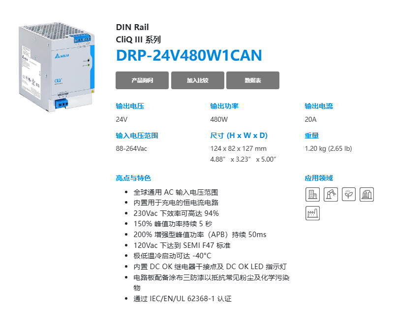 | 輸入電壓范圍 | DRP-24V□W1CAN: 88-264 VAC DRP-24V□W1CBN: 88-264 VAC (直流輸入范圍 88-375 VDC) 1 |