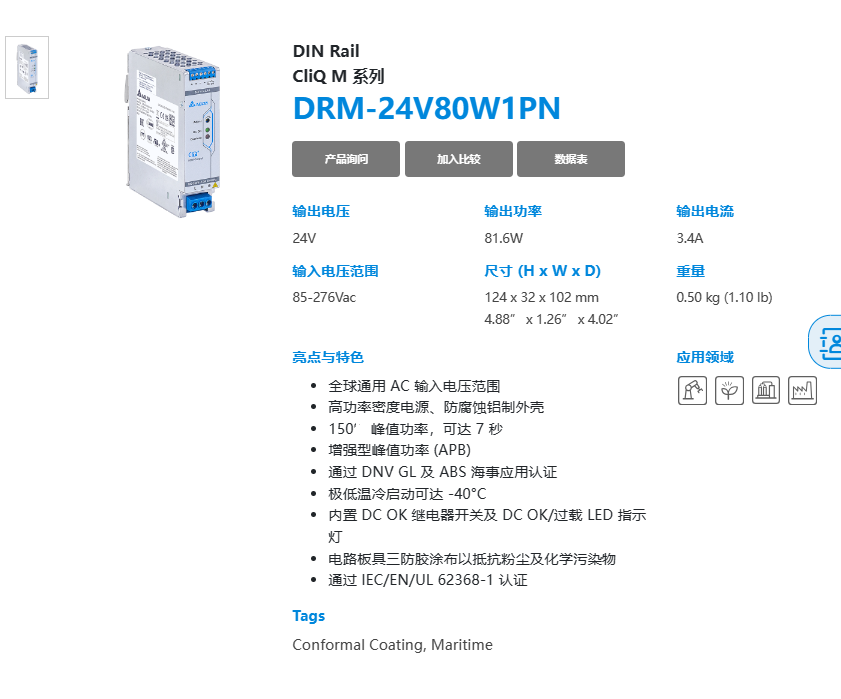 AC 輸入電壓范圍 高功率密度電源、防腐蝕鋁制外殼 150 峰值功率,可達 7 秒 增強型峰值功率 (APB) 通過 DNV GL 及 ABS 海事應用認證 極低溫冷啟動可達 -40°C 內置 DC OK 繼電器開關及 DC OK/過載 LED 指示燈 電路板具三防膠涂布以抵抗粉塵及化學污染物 通過 IEC/EN/UL 62368-1 認證
