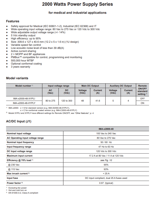 - Wide operating input voltage range: 80 Vac to 275 Vac or 120 Vdc to 300 Vdc