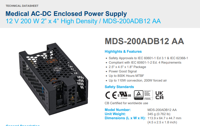 - Safety Approvals to IEC 60601-1 3.1rd ed. & IEC 60950-1
