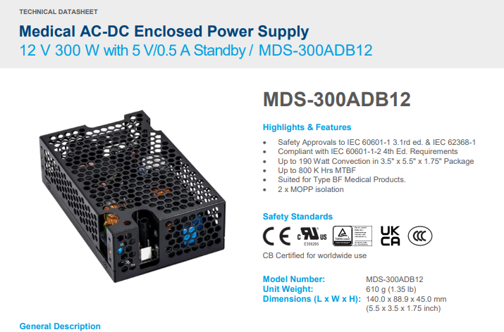 - Safety Approvals to IEC 60601-1 3.1rd ed. & IEC 62368-1