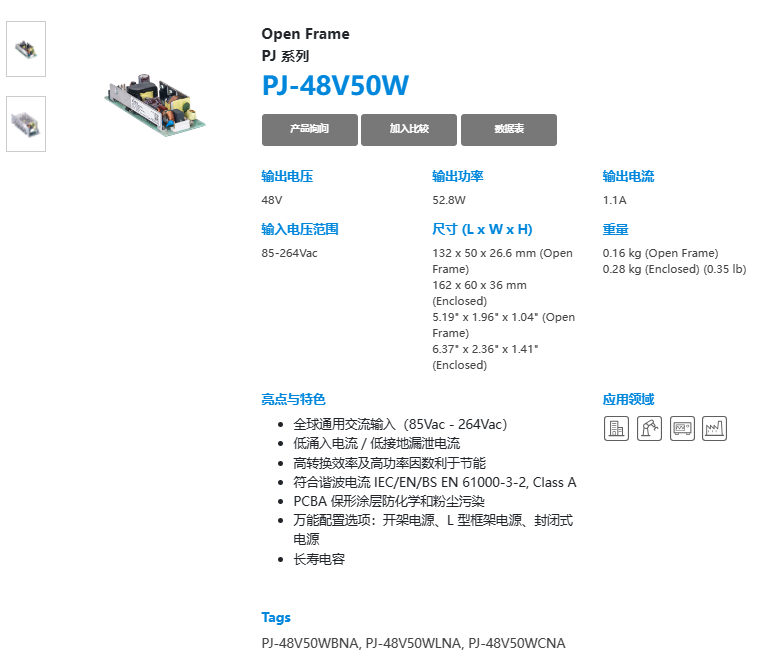 Open Frame PJ 系列 PJ-48V50W