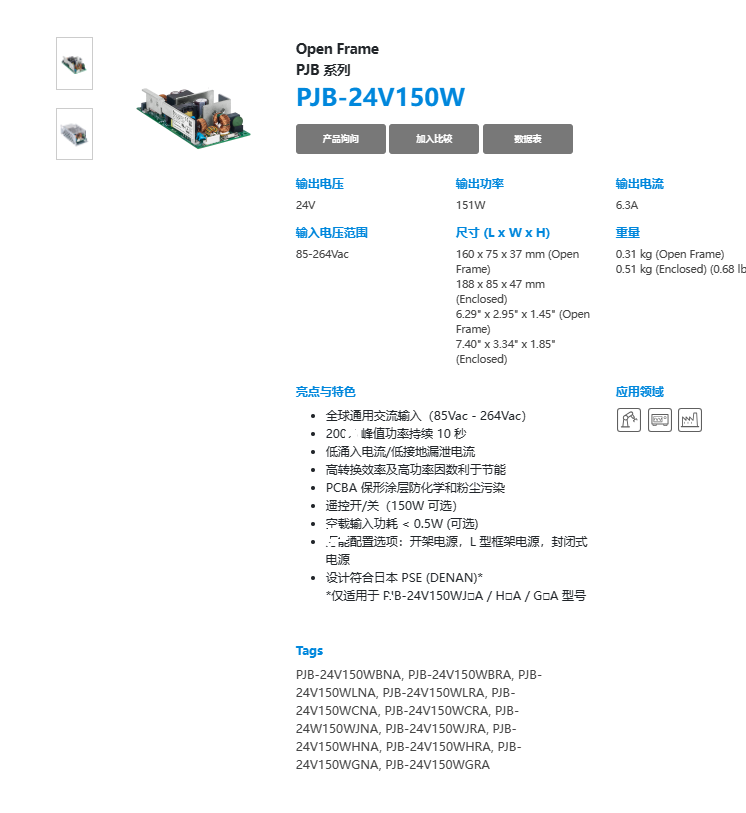 Open Frame PJB 系列 PJB-24V150W