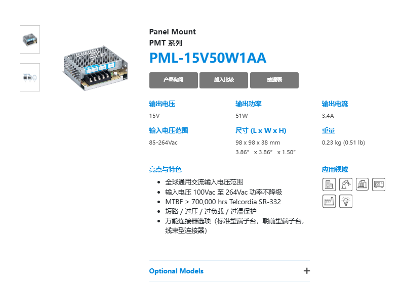 • 輸入電壓 100Vac 至 264Vac 功率不降級