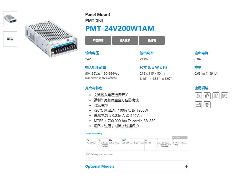 輸入電壓范圍 90-264 VAC 90-132 VAC, 180-264 VAC (選擇開關) 90-264 VAC 90-132 VAC, 180-264 VAC (選擇開關)