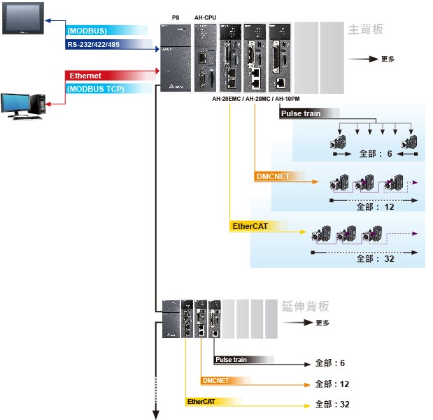- DMCNET:12軸同步時間為 1 ms